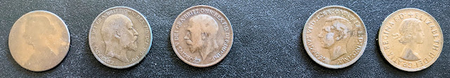 Before 1971, there were coins from multiple reigns in circulation (and for a while after, since the old one shilling / new 5 pence and the old 2 shilling (florin) / new 10 pence coins coexisted for a while). As children, we enjoyed finding the occassional very old coin. Here are some pennies I found in my change in the 60s, and kept as souvenirs: